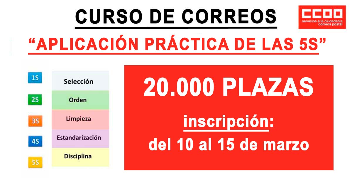 Correos ha publicado la convocatoria de un nuevo curso: “APLICACIÓN PRÁCTICA DE LAS 5S”. Con este curso, podrás aprender las herramientas para la aplicación práctica de los principios de la Metodología de las 5S que te ayuden a optimizar tiempos y recursos en el desarrollo de procesos.