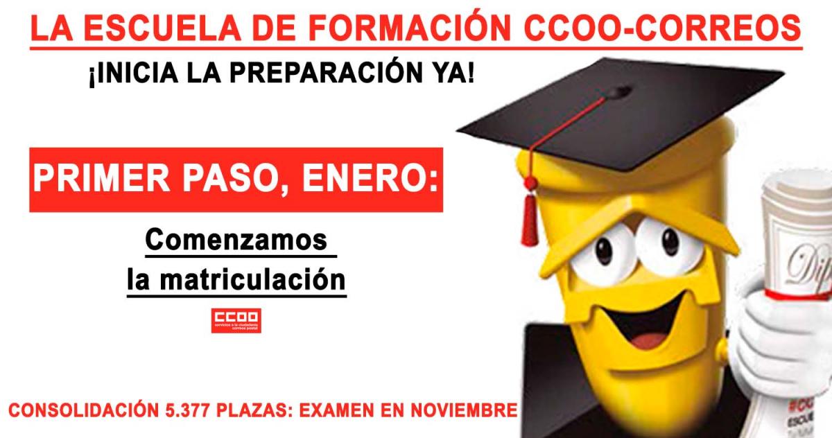 Al igual que en ediciones anteriores, la Escuela de Formación CCOO-Correos va a preparar la Consolidación de 5.377 plazas para que todos los interesados/as puedan llegar en las mejores condiciones al examen. Iniciaremos la matriculación en enero y la preparación dará comienzo en febrero-marzo.